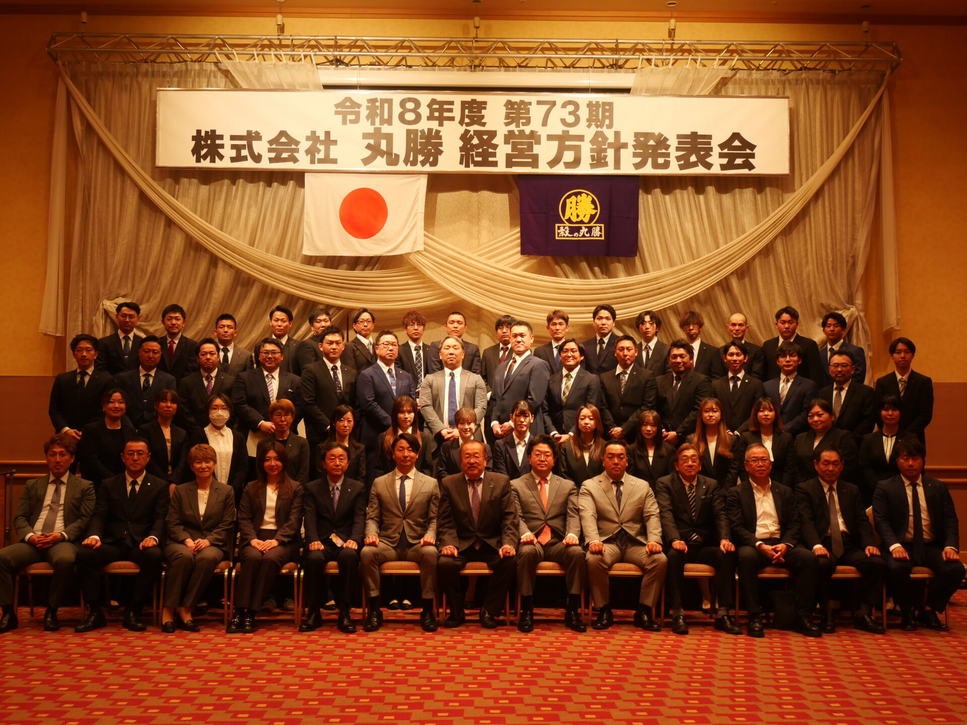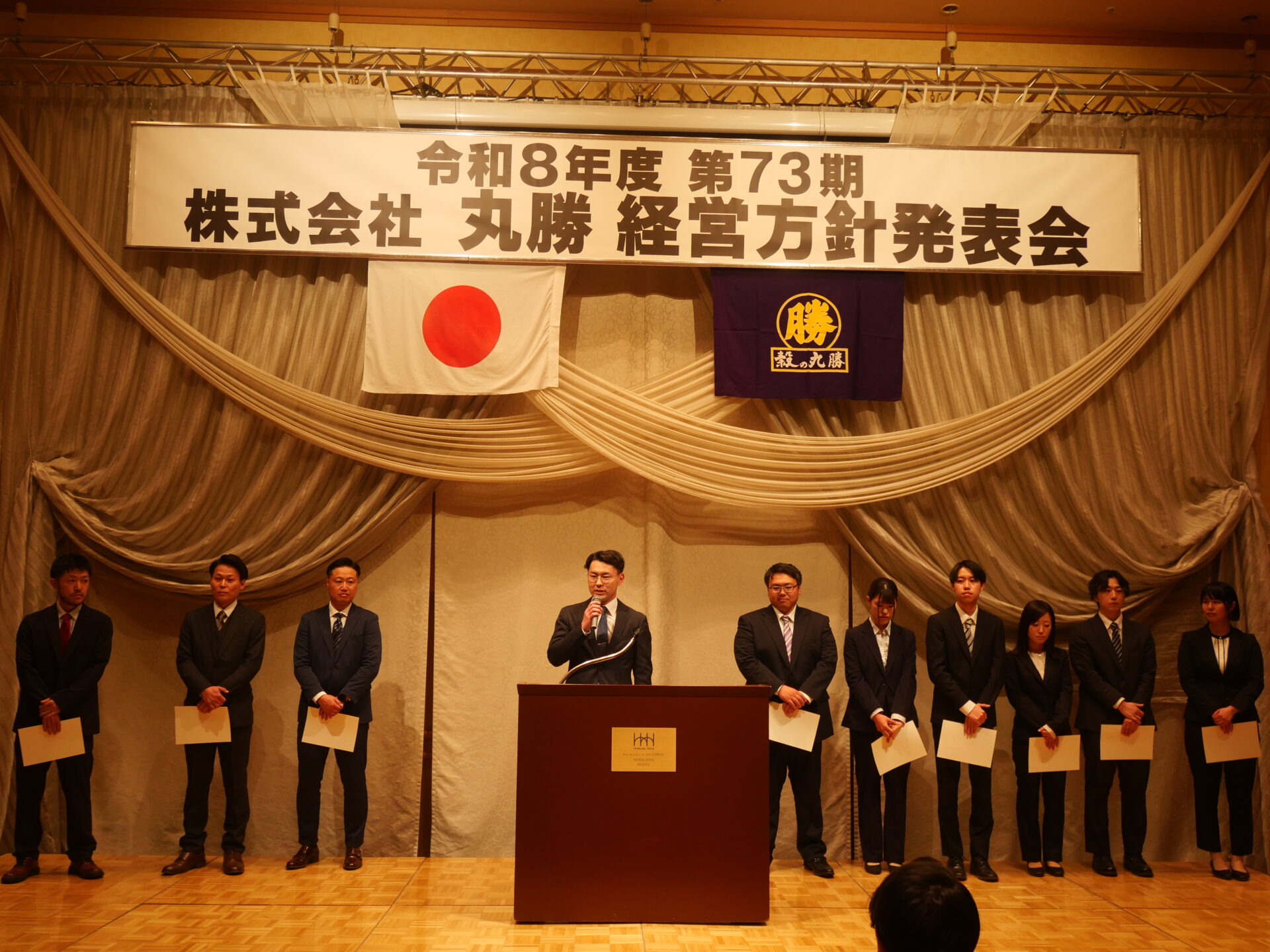 4月1日(水)、北海道ホテル様にて令和8年度入社式及び第73回丸勝経営方針発表会が行われ、基本スローガンに「100年に向けての挑戦・第3次創業期Ⅱ ~ホップ~」を掲げ、新年度に向けた決意を社員一同、語りました。